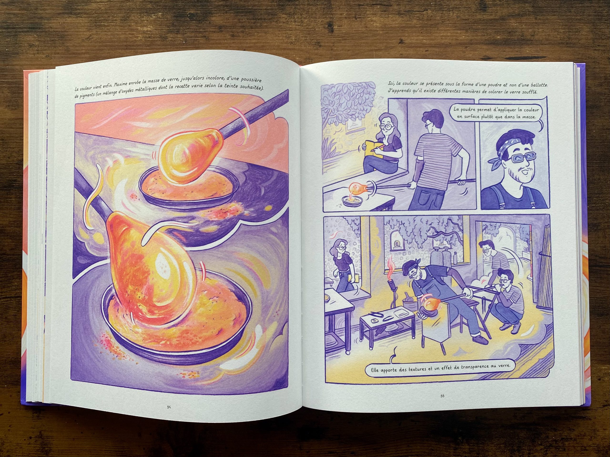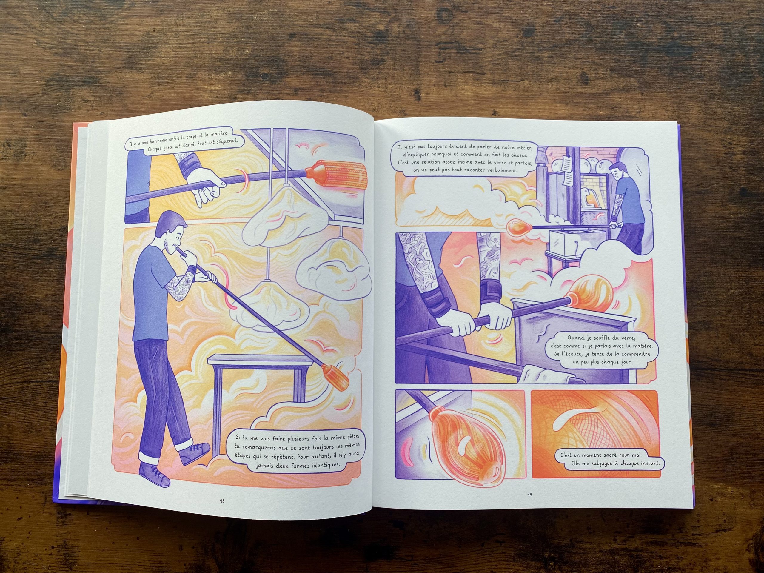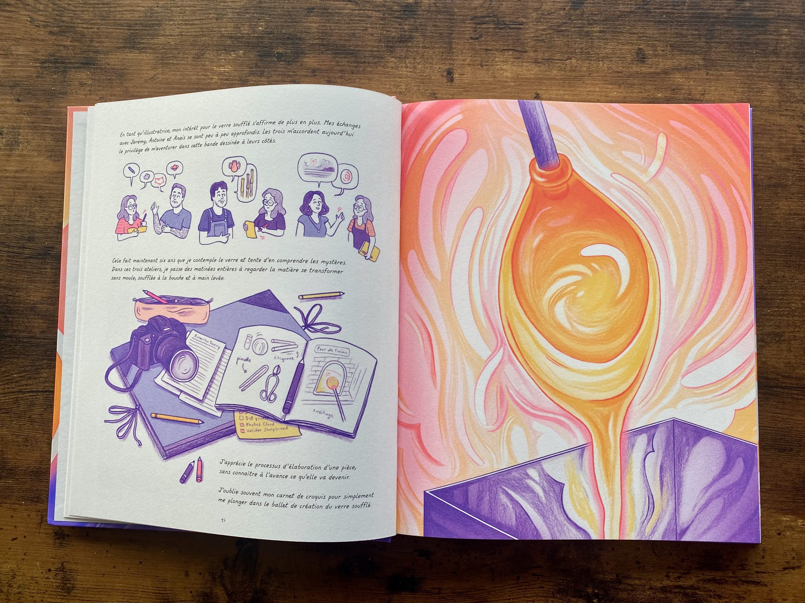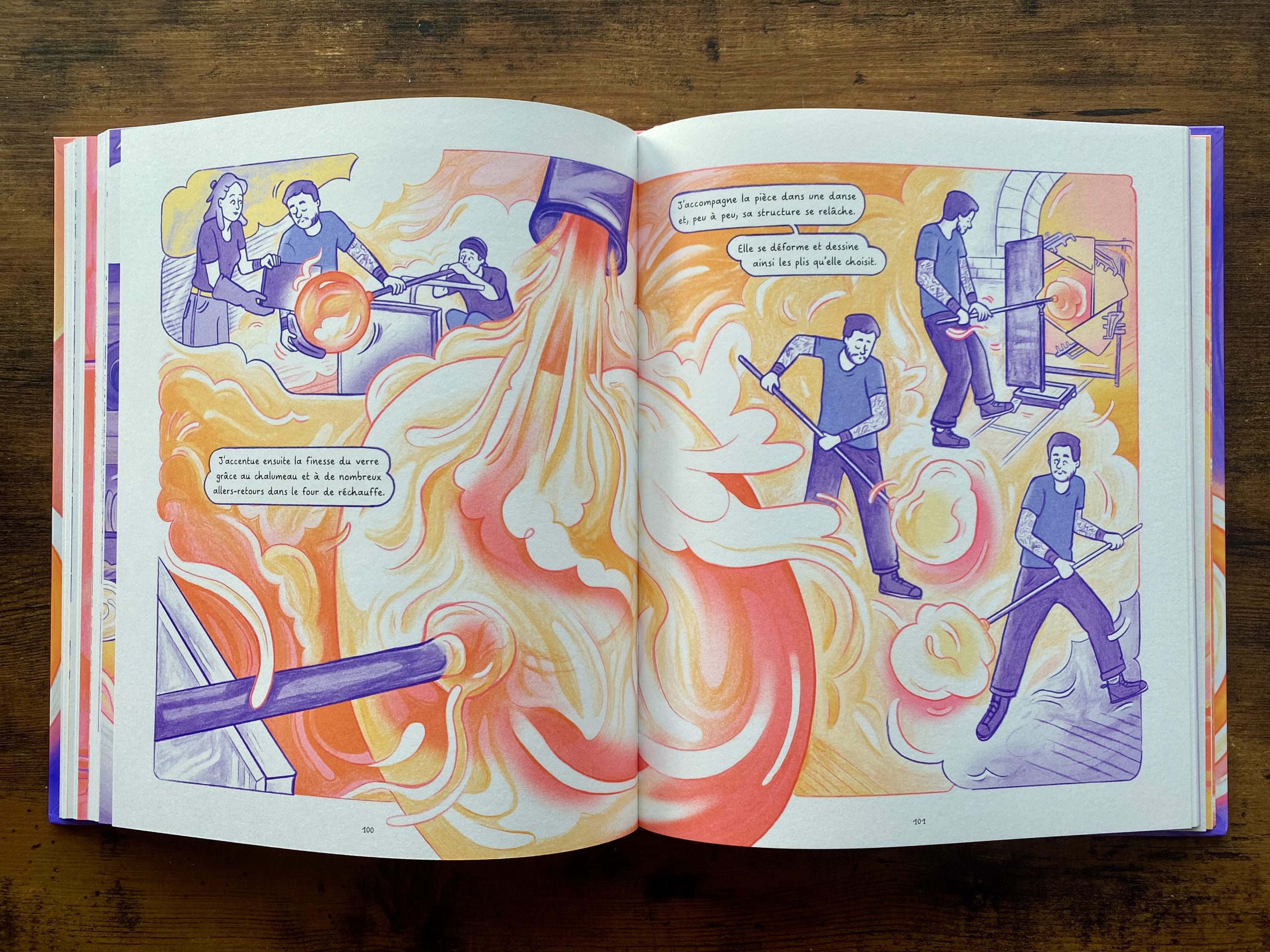 Le point de départ de ce reportage dessiné : la fascination de son autrice-illustratrice pour le soufflage de verre. C’est à travers le médium de la bande dessinée qu’elle décide de lui rendre hommage et de valoriser ces savoir-faire uniques.