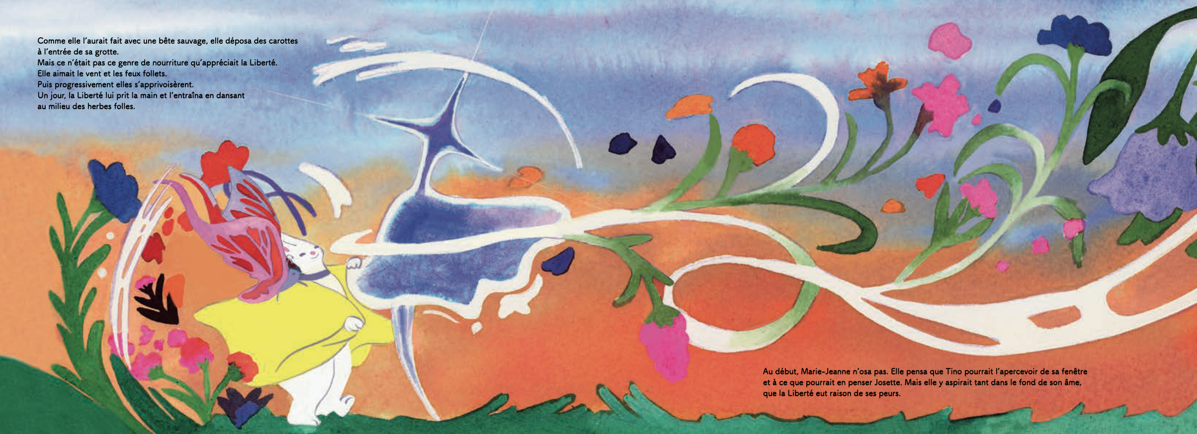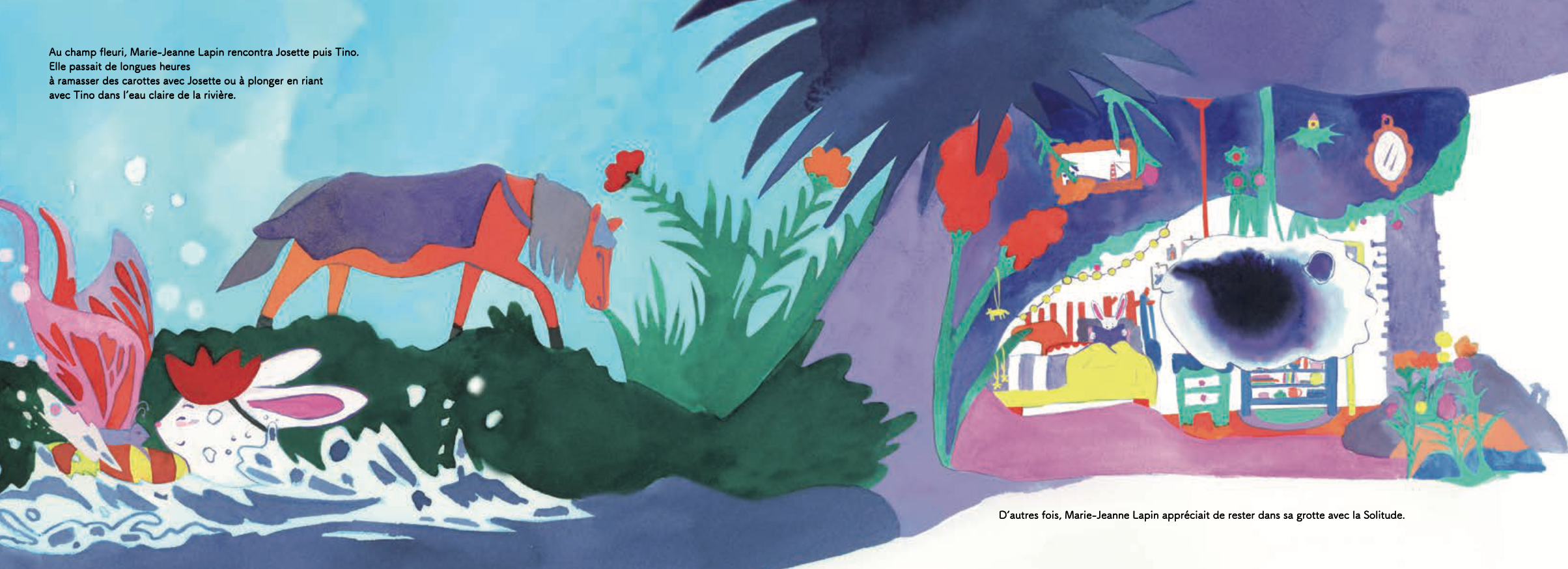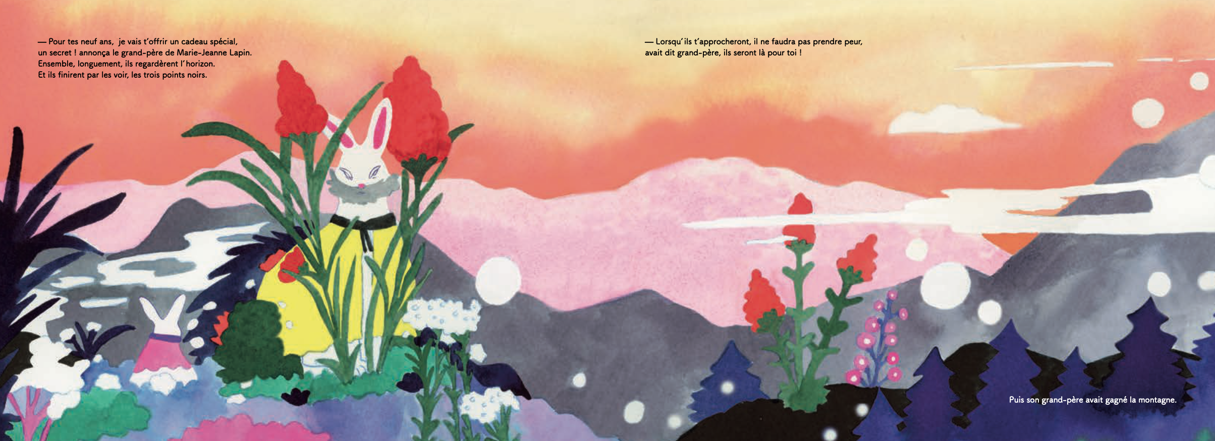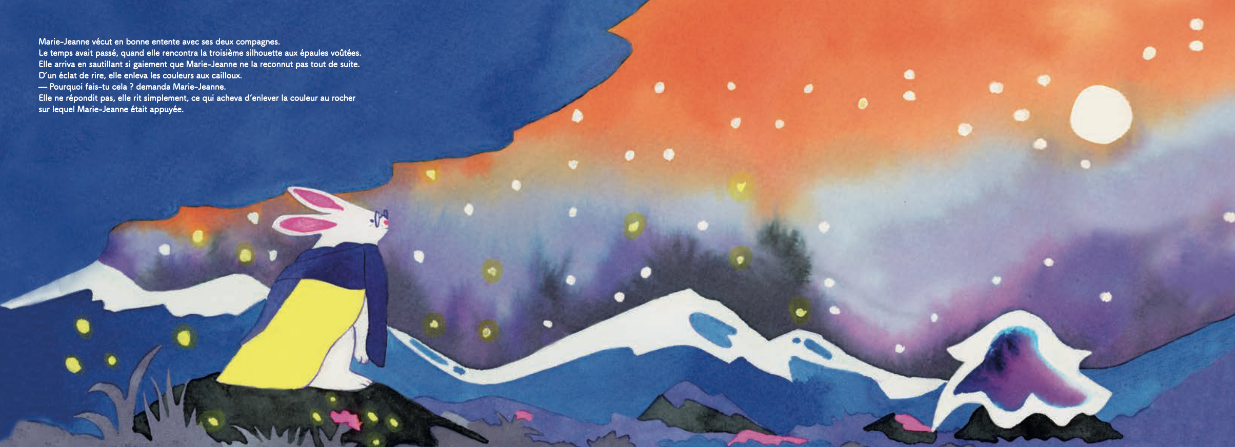 Marie-Jeanne Lapin reçoit de son grand-père un cadeau inhabituel : la promesse que trois compagnes l’accompagneront tout au long de sa vie. Au fil des années, elle rencontre la Solitude, puis la Liberté, et enfin la Mort. D’abord effrayantes, ces visiteuses deviennent peu à peu des alliées qui l’aident à grandir et à comprendre le cycle de la vie. Une histoire tendre sur l’acceptation et le passage du temps.